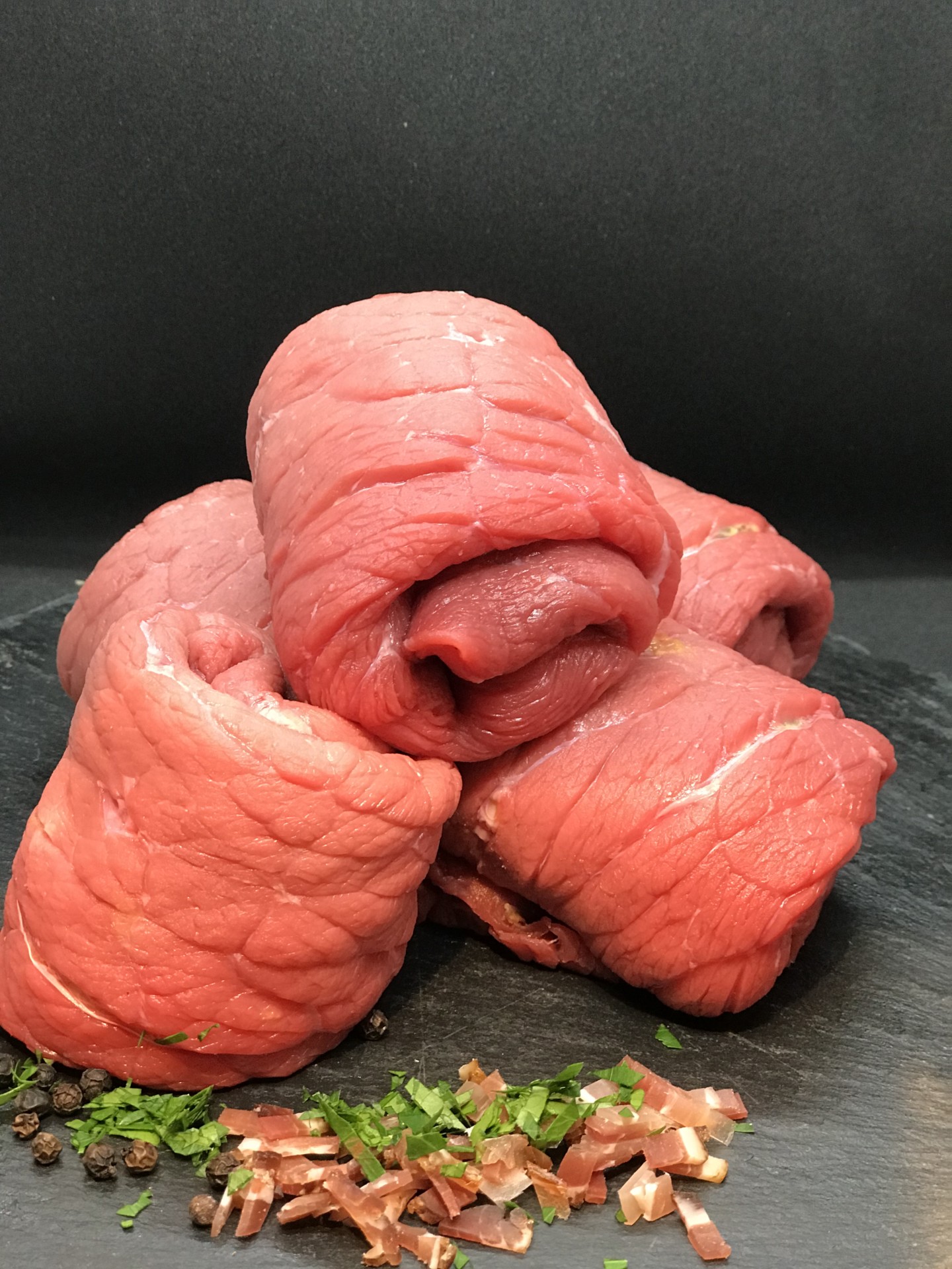 küchenfertige Rouladen aus der Rinderoberschale, gefüllt mit Dörrfleisch, Gewürzgurke, Senf und Zwiebeln
